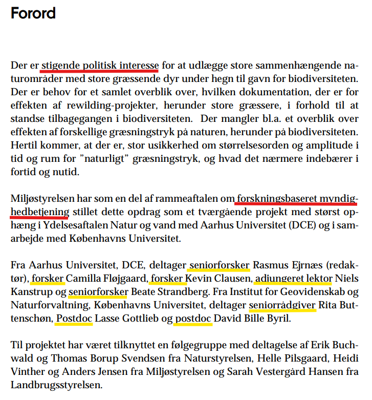 Det forklarer vi lige på en anden måde: Når Miljøstyrelsen og Naturstyrelsen bestiller denne “rewilding bibel” fra Aarhus Universitet (med støtte fra Københavns Universitet), så er det et politisk bestillingsarbejde, som kun skal udarbejde en videnskabelig rapport, der kommenterer på hvordan man kan finde måder at udøve rewilding på. Opgaven er IKKE at evaluere om denne rewilding er det bedste for naturen ud fra konsekvens beregninger af forskellige tilgange andre end rewilding. Der er kun et resultat: Hvordan kan man udføre rewilding? Og det er IKKE reel videnskabelig forskning!